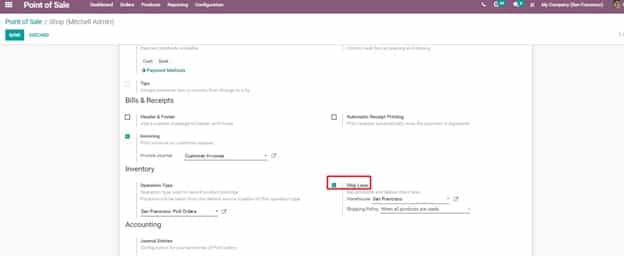 8. Point of Sale >> Dashboard >> Settings >> Inventory >> Ship Later