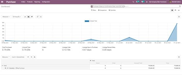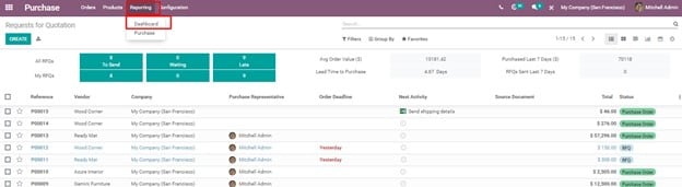 Purchase Dashboard provides an authentic and beautiful perspective for the dashboard which comprises all the purchase values and graphs. This dashboard gives enough information about the tax and untaxed based total. You can click on reporting tab on Odoo 15 dashboard.