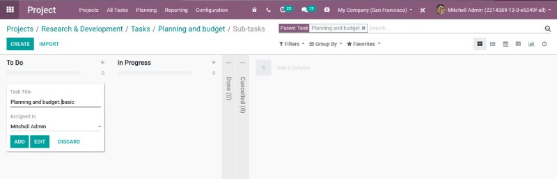 Clicking on the sub task button will navigate you to a new task page where you can create a sub task for the parent task.You can find the task title and the person to assign the sub task. Later you can click on the Add button. You can modify the subtask by clicking on the ‘Edit’ button.